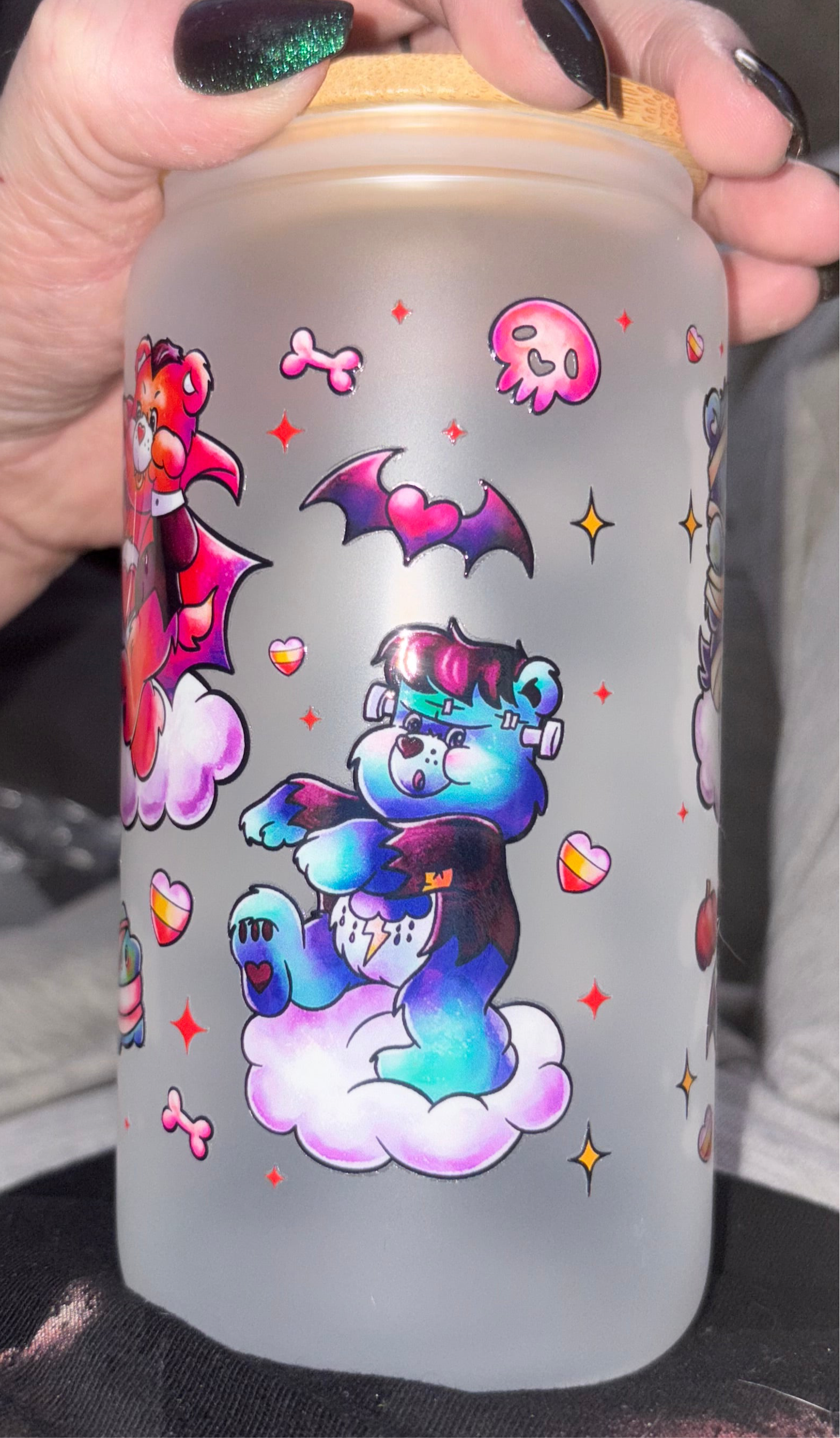 Introducing the Bearmonster 16oz frosted tumbler! Featuring a mashup of Care Bears and Universal Monsters, this tumbler holds 16oz of your favorite beverage in a frosted design. Bear with us (see what we did there?) as you enjoy your drink in style.